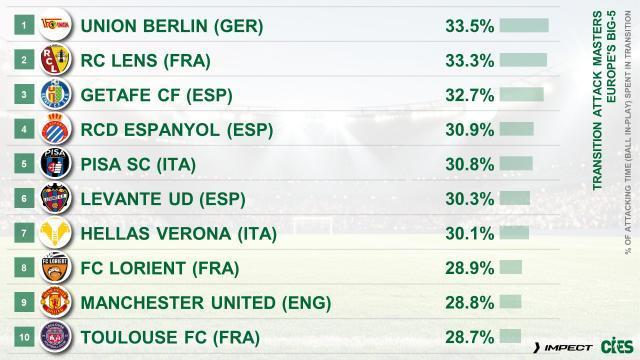 另一個榜單是最熱衷轉換進攻的球隊,雖然轉換進攻與傳統(tǒng)的防守反擊并不能完全劃等號——轉換進攻強調由守轉攻的過程,但不一定是消極蹲守,也可以是陣型前壓,在中前場就展開逼搶。但總的來說,防守反擊也屬于轉換進攻,而我們也可以看到這個榜單前十幾乎一水是各聯賽的中下游球隊,唯獨排名第九的曼聯成了豪門“顯眼包”。當然,戰(zhàn)術本無高低優(yōu)劣之分,黑貓白貓,能抓老鼠就是好貓。朗斯目前法甲第三(上賽季第八),靠的是聯賽防守第二好的表現,相比同分的馬賽他們進球不多,反而是錯失進球機會的數據法甲第一,這也說明了他們的確通過轉換進攻獲得了大量機會。
