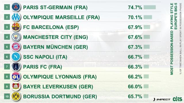 “足球天文臺”(CIES)公布歐洲五大聯賽球隊“陣地進攻”和“轉換進攻”榜單。排名顯示,法甲的巴黎和馬賽最熱衷于通過掌控球權發(fā)起進攻,占比超過了70%,排名三四的則是傳控大師巴薩和曼城。值得注意的是,前五的球隊中,瓜迪奧拉執(zhí)教過巴薩、拜仁、曼城三支球隊,恩里克和弗利克也執(zhí)教過其中兩支,拜仁主帥孔帕尼在曼城師承瓜迪奧拉,拜仁當初選擇孔帕尼,也是得到了瓜帥的充分肯定??梢哉f,瓜迪奧拉主義目前仍是菁英足球世界的頂層哲學源頭。