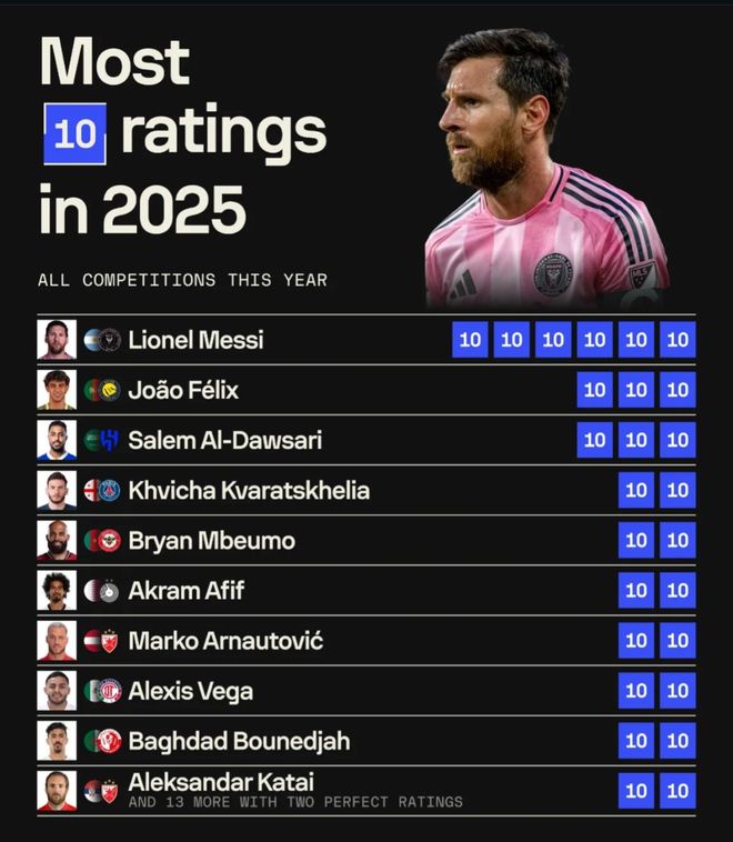 11月10日。有著名評(píng)分機(jī)構(gòu)sofascore統(tǒng)計(jì)并公布他們今年給出的所有滿分10分排行榜,并沒(méi)有區(qū)分聯(lián)賽,而是全世界一起來(lái)。其中已經(jīng)不在五大聯(lián)賽的歷史第一人梅西憑借在快退役但依舊沒(méi)退化的世界第一檔表現(xiàn),踢出了世界第一的滿分10分次數(shù),而且是獨(dú)一檔,一共有6次。超過(guò)所有五大聯(lián)賽超巨。第二是巴薩見(jiàn)五大聯(lián)賽棄將、C羅大腿、葡萄牙國(guó)腳、利雅得勝利最佳球員、沙特MVP候選菲利克斯,一共3次。