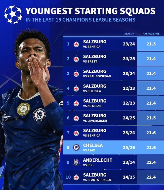 平均21.6歲,切爾西對賈府首發(fā)為歐冠近15個賽季第8年輕