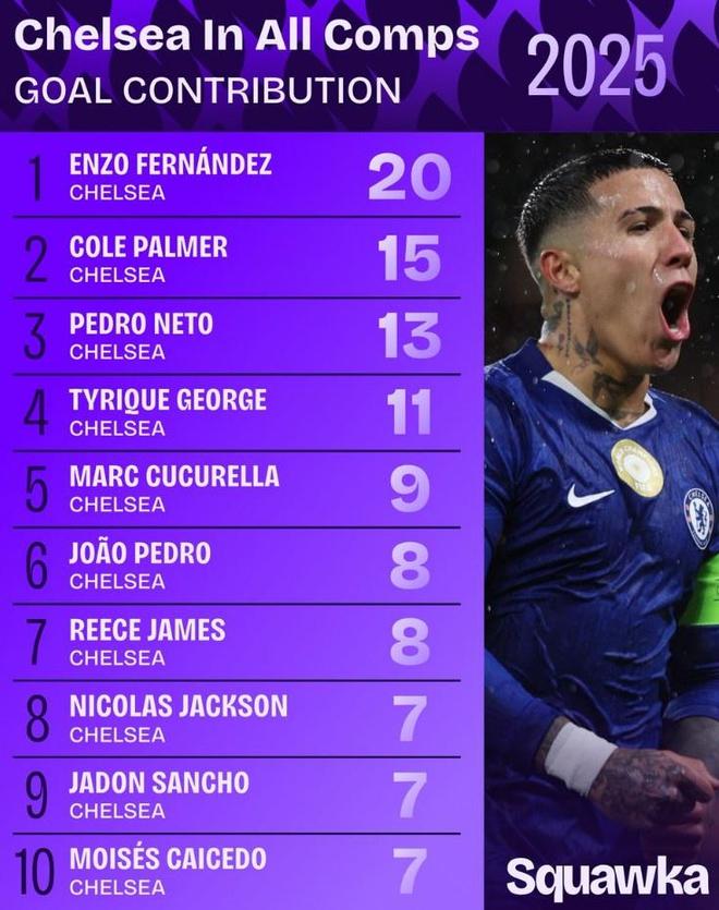數(shù)據(jù)網(wǎng)站Squawka盤(pán)點(diǎn)了2025年切爾西球員各項(xiàng)賽事參與進(jìn)球榜單,具體如下(進(jìn)球+助攻):