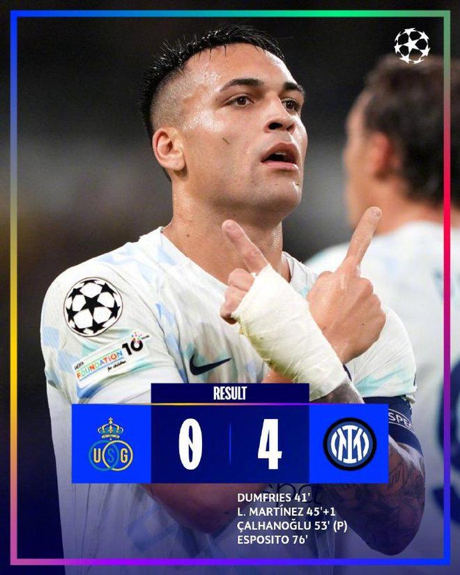 不過(guò)球隊(duì)在第41分鐘才打破僵局,鄧弗里斯先聲奪人,隨后勞塔羅再下一城,下半場(chǎng)恰爾汗奧盧和埃斯波西托先后進(jìn)球鎖定勝局。