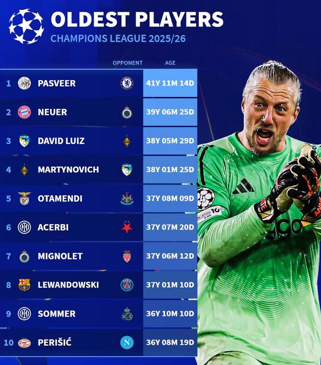 1. 帕斯維爾(阿賈克斯) 41歲11個(gè)月14天(vs切爾西)